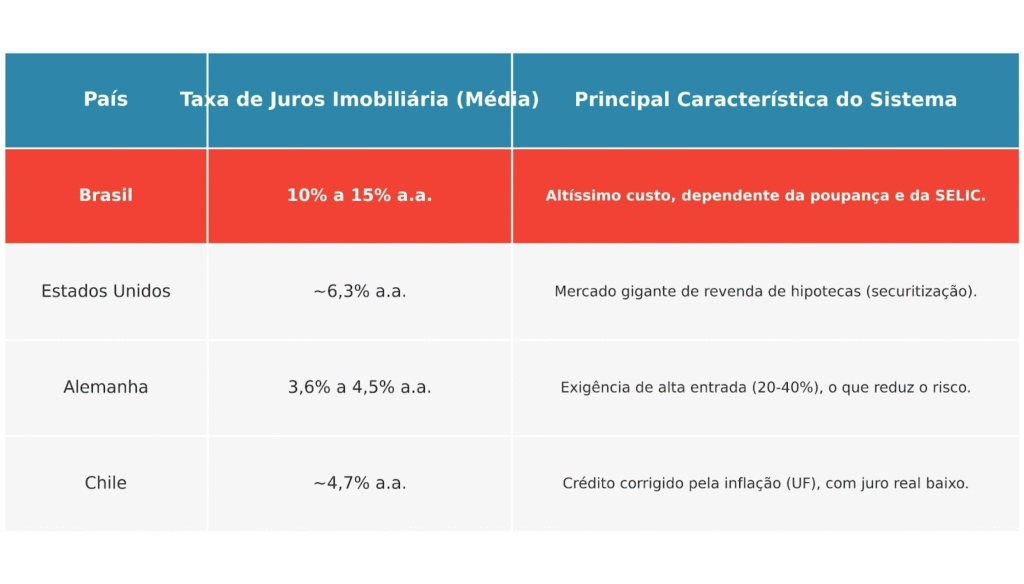 - Estados Unidos: Taxa média de 6,3% ao ano. O sistema permite que os bancos vendam as hipotecas para agências garantidas pelo governo, pulverizando o risco e barateando o crédito.
